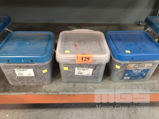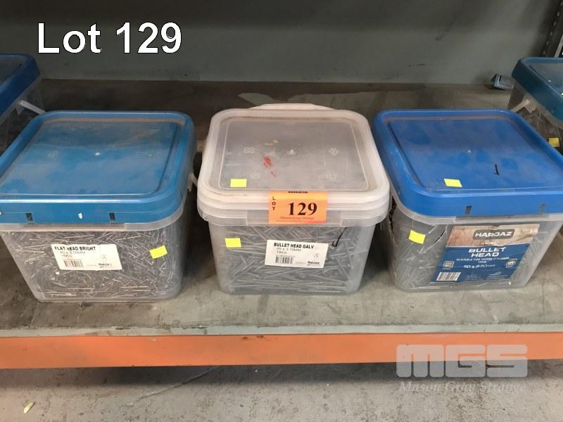 3 x BUCKETS ASSORTED NAILS,,, TRIO, HARDAZ, FLAT HEAD BRIGHT, 40 x 2.00mm BULLET HEAD GALV, 65 x 3.15mm, BULLET HEAD BRIGHT, 50 x 2.80mm