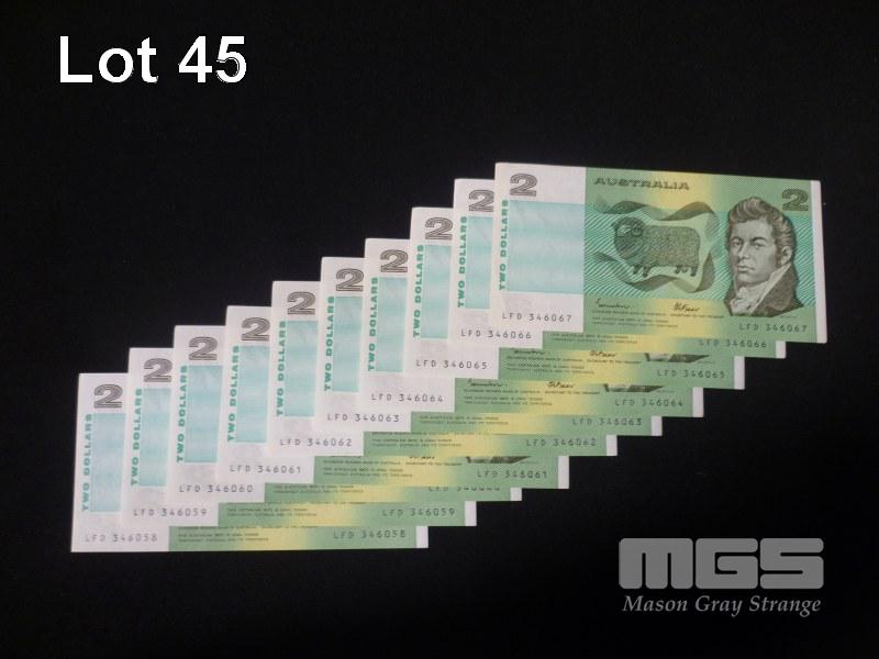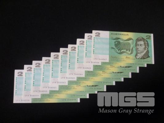 1985 10 x $2.00 NOTES CONSECUTIVE JOHNSTON FRAZER UNC