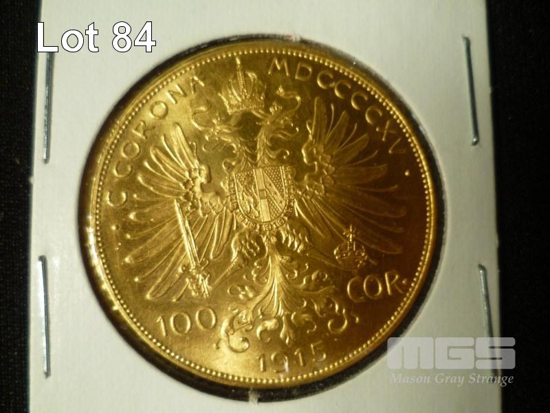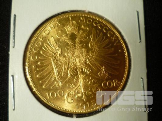 1915 RESTRIKE AUSTRIAN 100 CORONA GOLD COIN, 22 KARAT GOLD, FINE WEIGHT 33.8 GRAMS