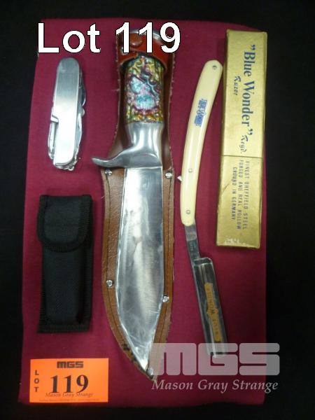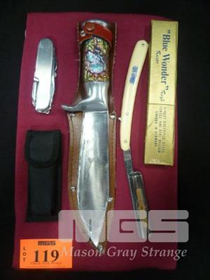 BLUE WONDER CUT THROAT RAZOR, BOWIE KNIFE & POCKET KNIFE