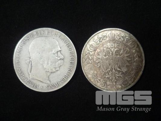 2 X AUSTRIAN 5 CORONA SILVER COINS,1900 & 1907
