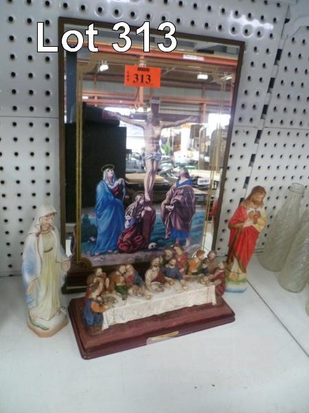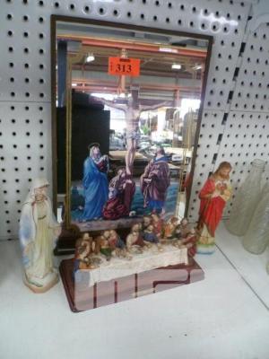VINTAGE RELIGIOUS CRUCIFIXION MIRROR, 46 x 31cm & 3 x STATUES