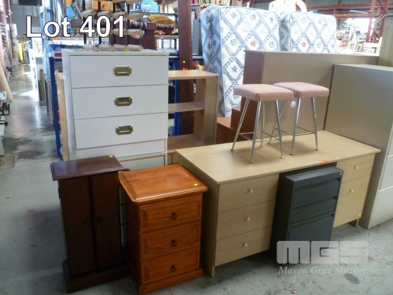 TIMBER LAMINATE DESK, MOBILE UNIT, PAIR STOOLS, 3 x ASSORTED BEDSIDE CABINETS, CD CABINET & WINE RACK