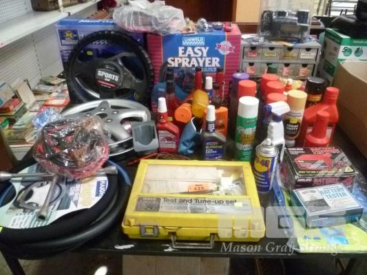 STEERING WHEEL COVERS, EASY SPRAYER, BATTERY CHARGER, BATTERY TESTER, ETC, 1 x TABLE