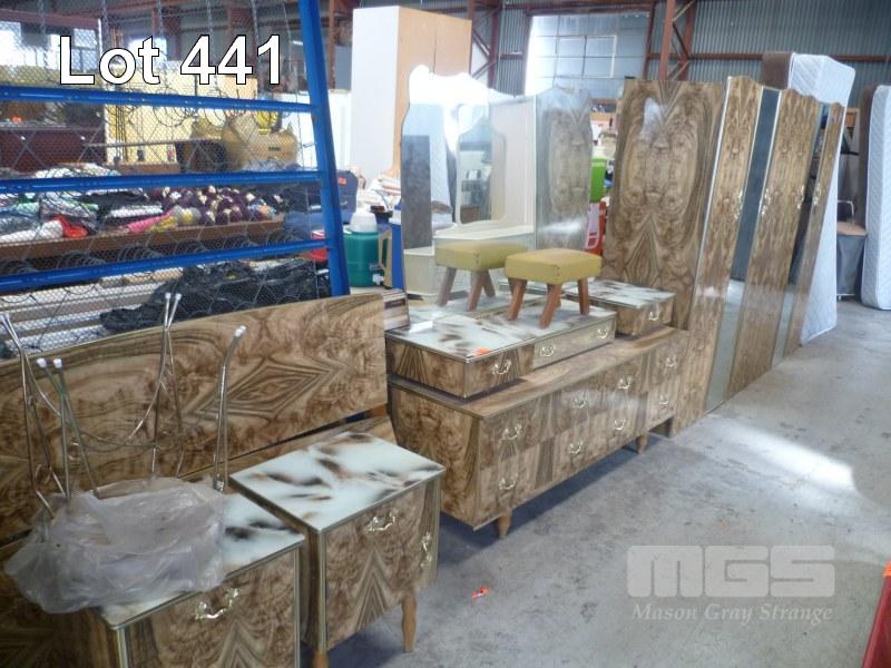 TIMBER LAMINATE, MID CENTURY 5 PIECE BEDROOM SUITE, INC PAIR WARDROBES, DRESSER, BEDSIDE CABINETS & DOUBLE BED FRAME