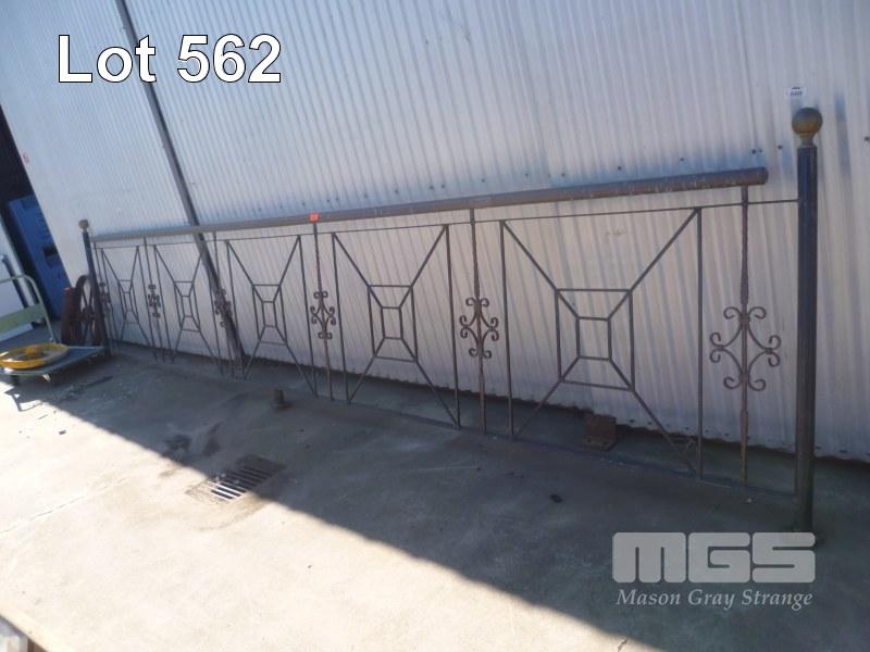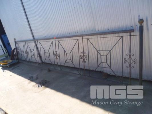 LARGE WROUGHT IRON FENCE PANEL SECTION, COPPER TOP RAIL & BRASS FINIALS, 5.8 MTRS LONG X 1.2 MTR H