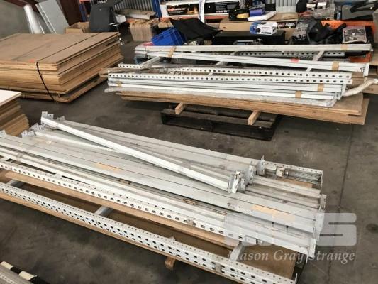 PALLET RACK SHELVING, 84cm (D) 4 x UPRIGHTS, 240cm 20 x CROSS BEAMS, 240cm 8 x CROSS BEAMS, 180cm WITH PARTICLEBOARD SHELVES