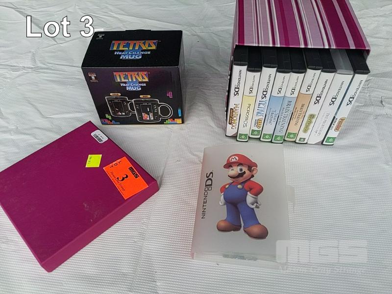 9 X NINTENDO DS GAMES AND SUPER MARIO GAME POUCH BOOKLET. GAMES INCLUDE TETRIS, PICROSS, MAHJONGG, BRAIN TRAINING, SIGHT TRAINING ETC. TETRIS HEAT CHANGE MUG.