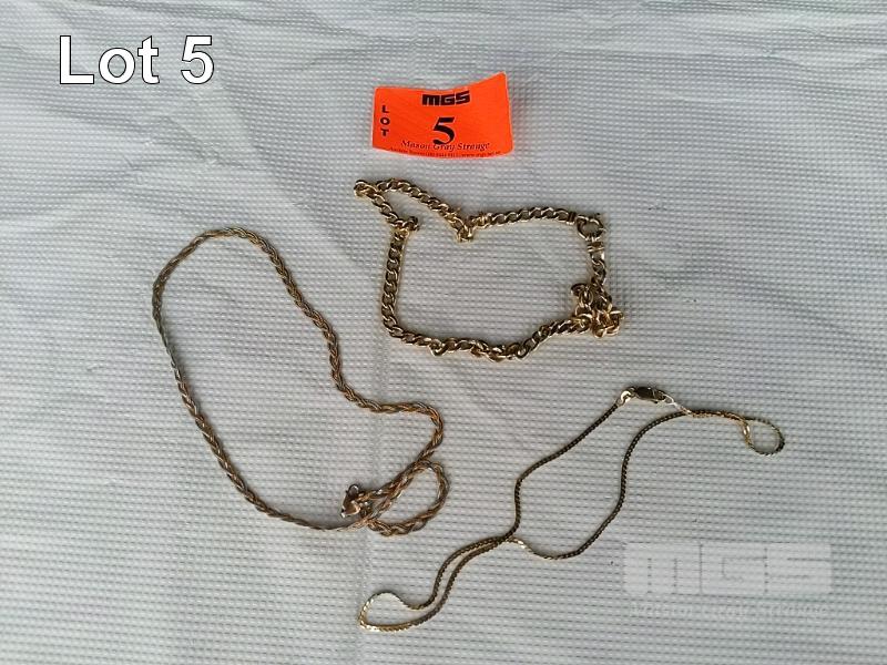 4.9gm THREE STRAND GOLD NECKLACE, 40cm, MARKED 9CT COMPRISING GOLD ROSE GOLD AND WHITE GOLD. GOLD PLATED COPPER FILLED NECKLACE, ITALIAN MADE. 3.92gm GOLD NECKLACE, 40cm, FLAT LINK MARKED "NZ375 ITALY".