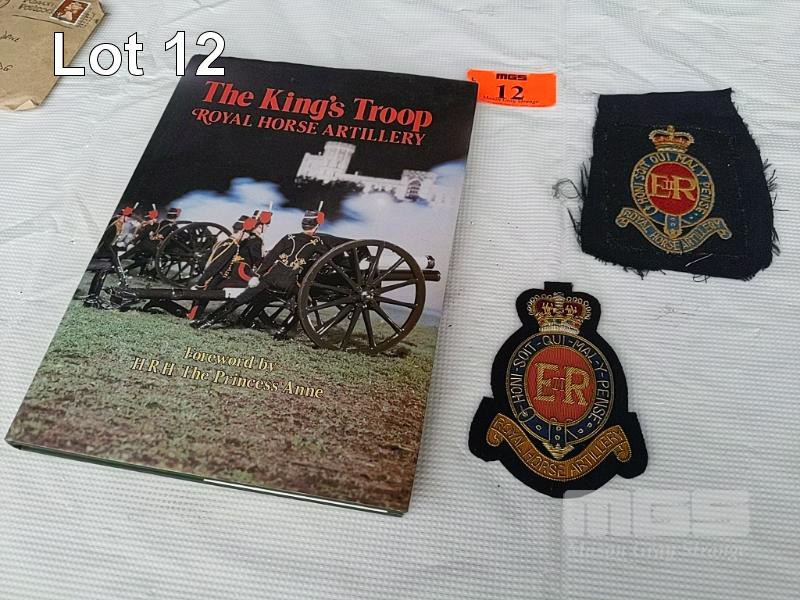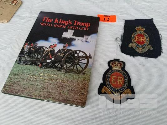 2 x ROYAL HORSE ARTILLERY BADGES AND "THE KING'S TROOP" ROYAL HORSE ARTILLERY BOOK.