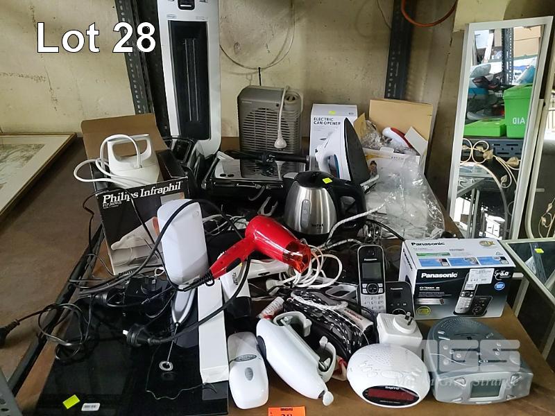 VARIOUS HOUSEHOLD ELECTRICAL INCLUDING CERAMIC HEATER, BLOW HEATER, ELECTRIC CAN OPENER, CLOTHES IRONS, TOASTED SANDWICH MAKER, TOASTER, KETTLES, MIXER, HAIRDRYERS, TELEPHONES, BATHROOM SCALES ETC (1 x BAY).