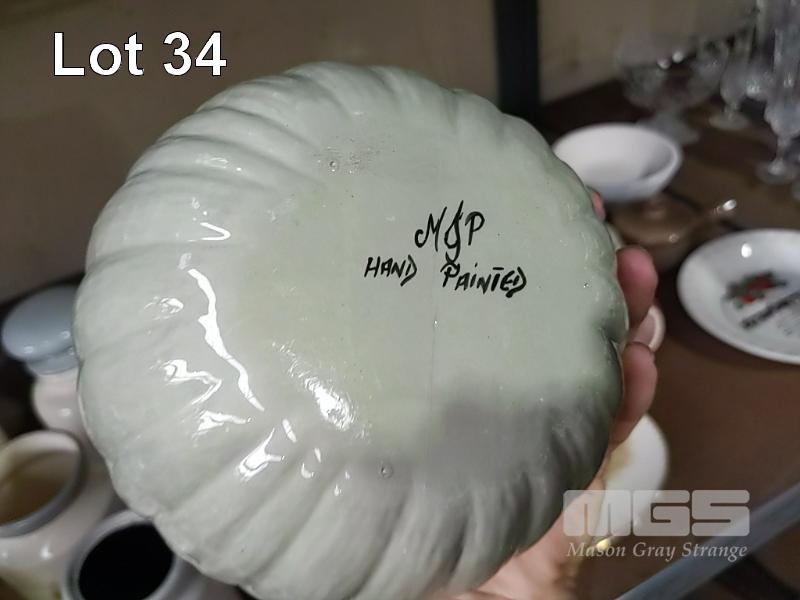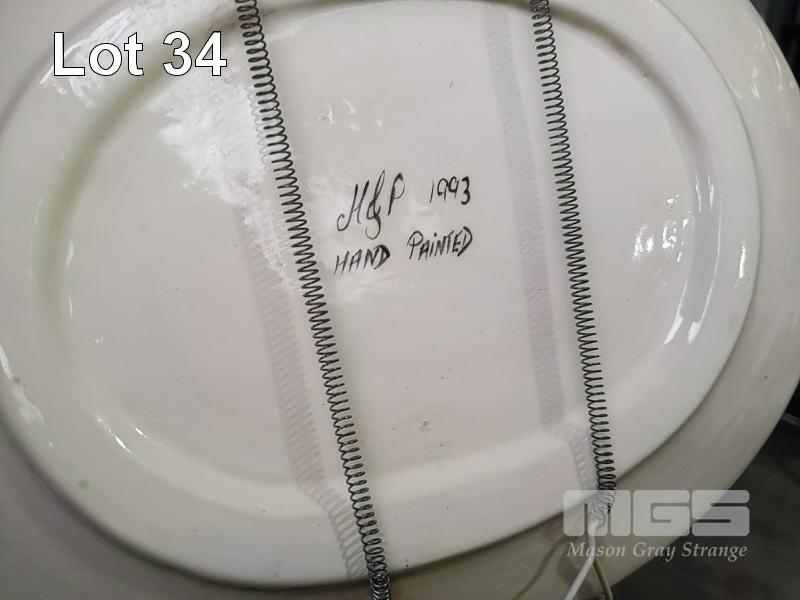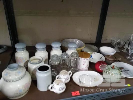 HAND PAINTED KITCHEN STORAGE JARS AND MILK JUG, PLATTER, PUMPKIN JAR & SUGAR BOWL AND OTHER PLATES, BOWLS JARS & POTS.