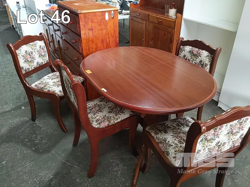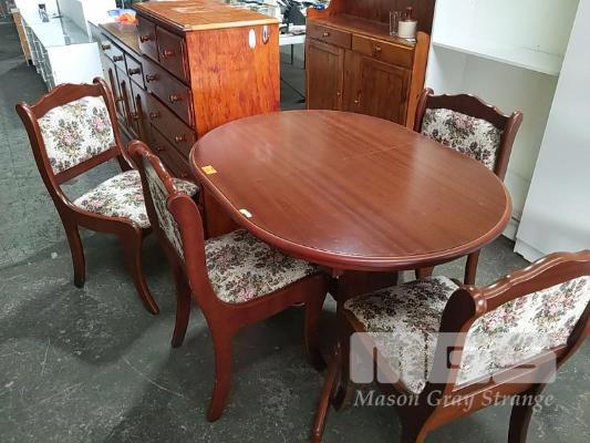 EXTENDABLE DINING TABLE AND 4 UPHOLSTERED CHAIRS.
