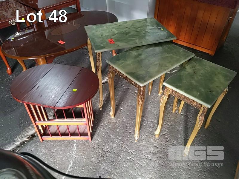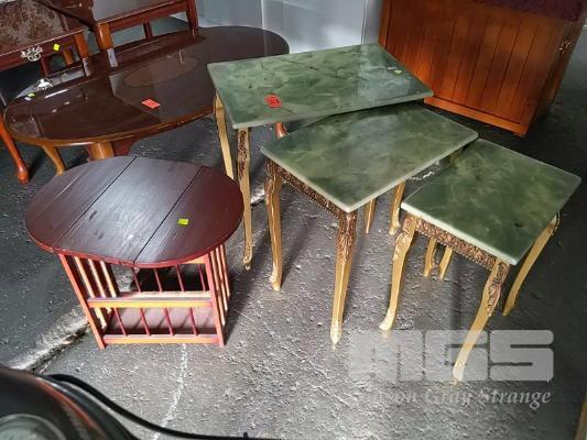 NESTED SIDE TABLE SET OF 3 WITH FAUX MARBLE TOPS AND SMALL MAGAZINE TABLE.