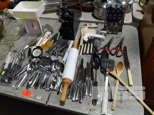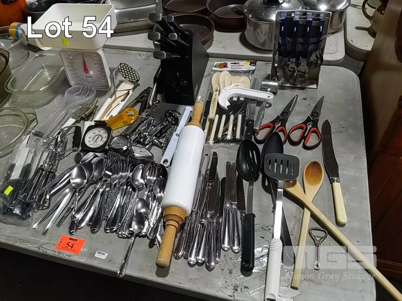 CUTLERY AND OTHER KITCHEN UTENSILS, WILTSHIRE STAYSHARP KNIFE BLOCK, ROLLING PIN, SALTER KITCHEN SCALES ETC.