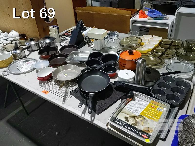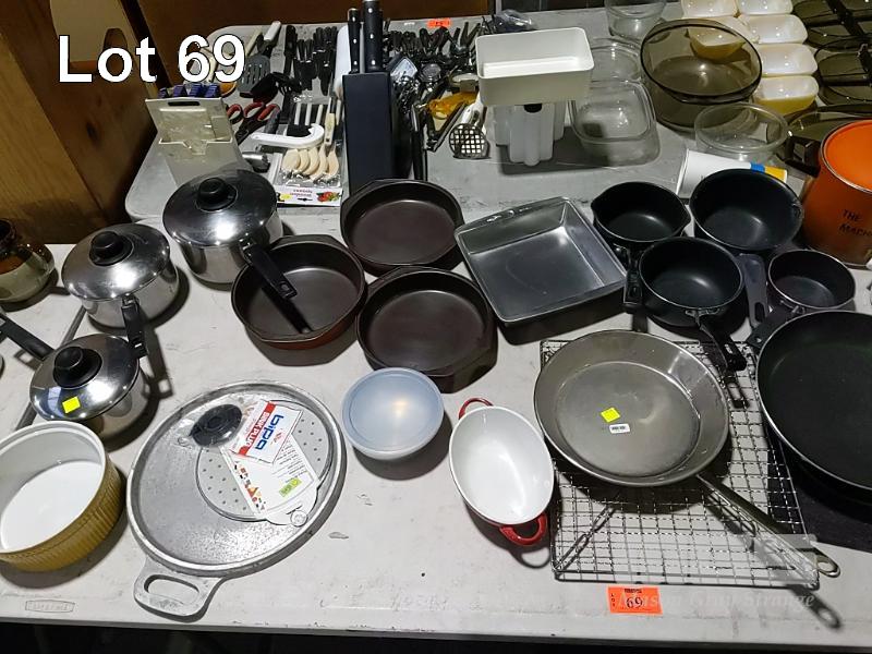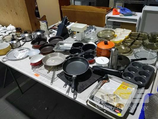 POTS, PANS, BAKING TRAYS FRYING PANS, COOKWARE ETC (1x TABLE).