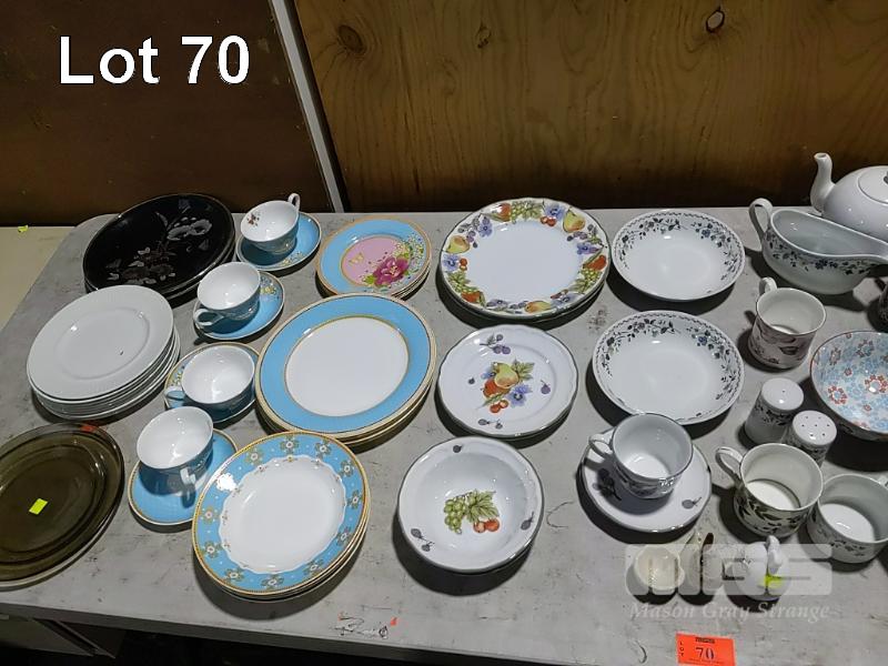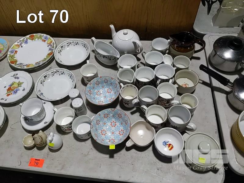 CROCKERY, PART DINNER SETS, CUPS & MUGS, TEA POT, JUGS ETC. (1 x TABLE).