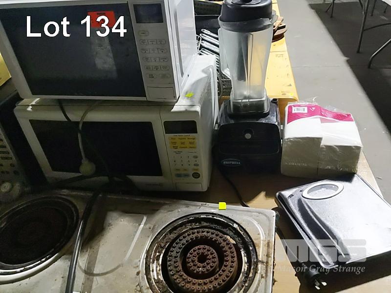 BOWIE TWINTOP PORTABLE GAS BURNER, 3 x MICROWAVE OVENS, QUIPWELL COMMERCIAL BLENDER, BATHROOM SCALES, TV WALL BRACKET, 6 x SMART POWER BOARDS ETC (1 x TABLE).