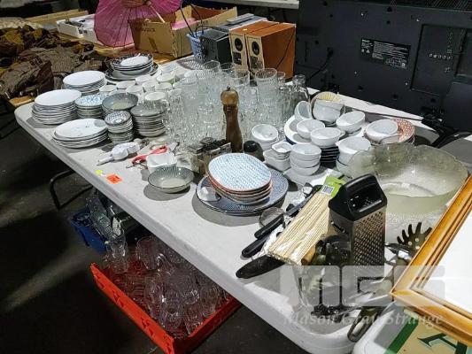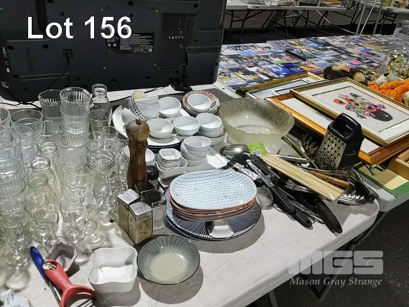 CROCKERY INCLUDING PLATES, BOWLS, SERVING PLATES AND CUPS & MUGS, KITCHEN UTENSILS, SALT AND PEPPER SHAKERS AND LARGE QUANTITY OF GLASSWARE INCLUDING JUGS, TUMBLERS, PORT GLASSES ETC (1x TABLE AND UNDER TABLE).