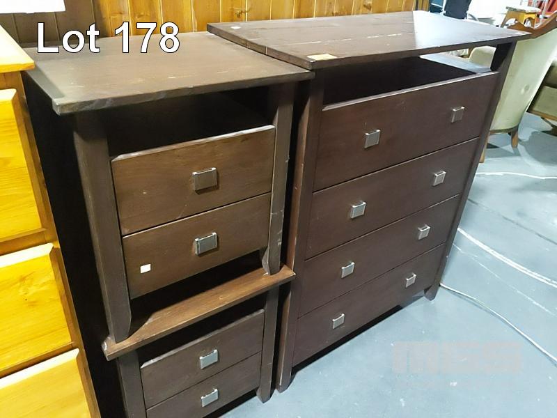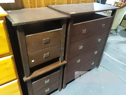 TIMBER CHEST OF DRAWERS AND MATCHING BEDSIDE TABLES.