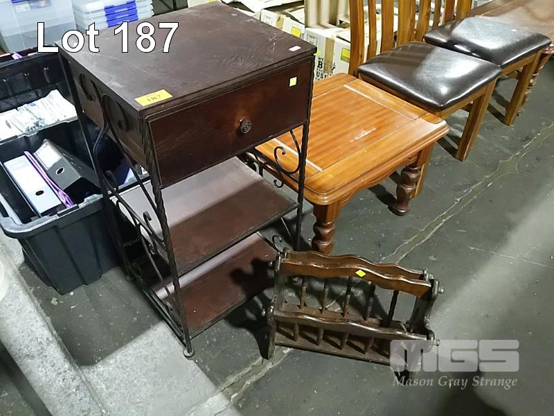 WROUGHT IRON STYLE SINGLE DRAWER METAL AND WOOD SIDE STAND WITH MAGAZINE HOLDER.