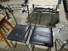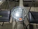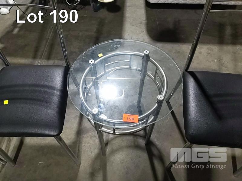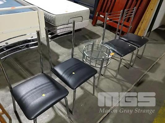 4 x CHROME STEEL CHAIRS WITH BLACK VINYL CUSHIONS AND MATCHING OVAL GLASS TOP COFFEE TABLE.