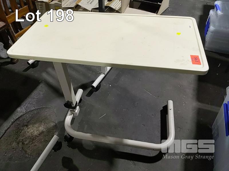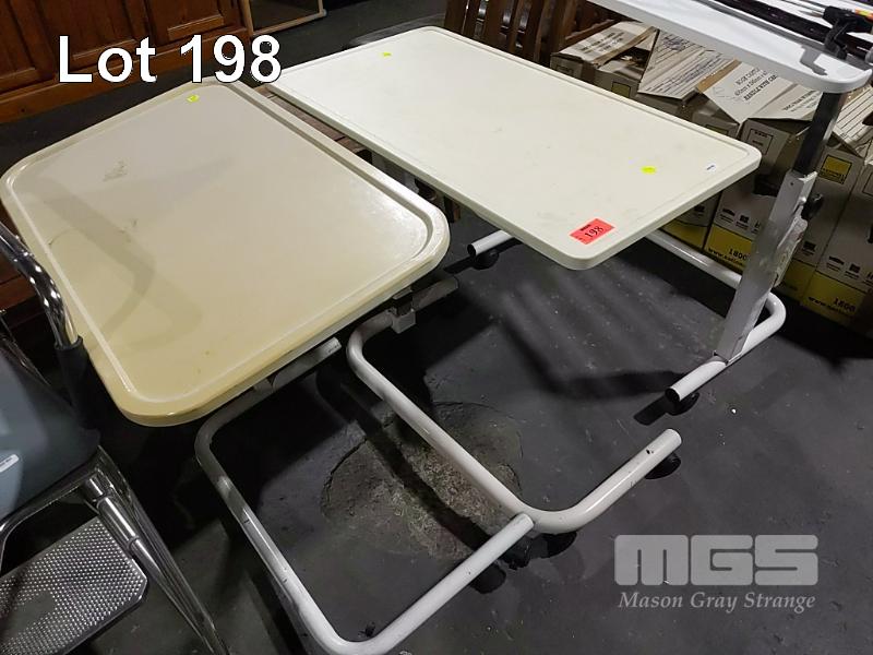2 x MOBILE OVERBED TABLES. ONE MISSING CASTOR.