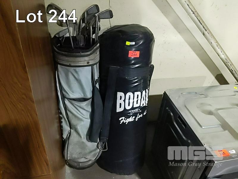 BODEN PUNCHING BAG AND SET OF 9 GOLF CLUBS IN BAG.