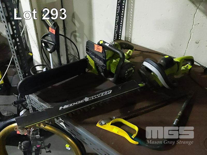 RYOBI 1900W ELECTRIC 240V CHAINSAW WITH 406mm BAR, RYOBI 240V ELECTRIC HEDGE TRIMMER (RHT600RLG) AND BRANCH SAW.