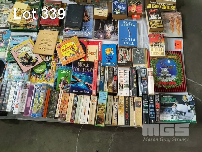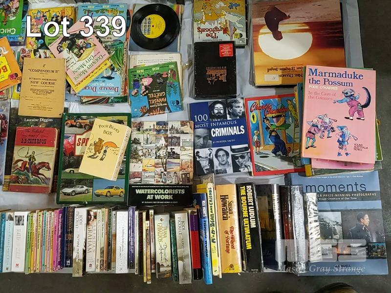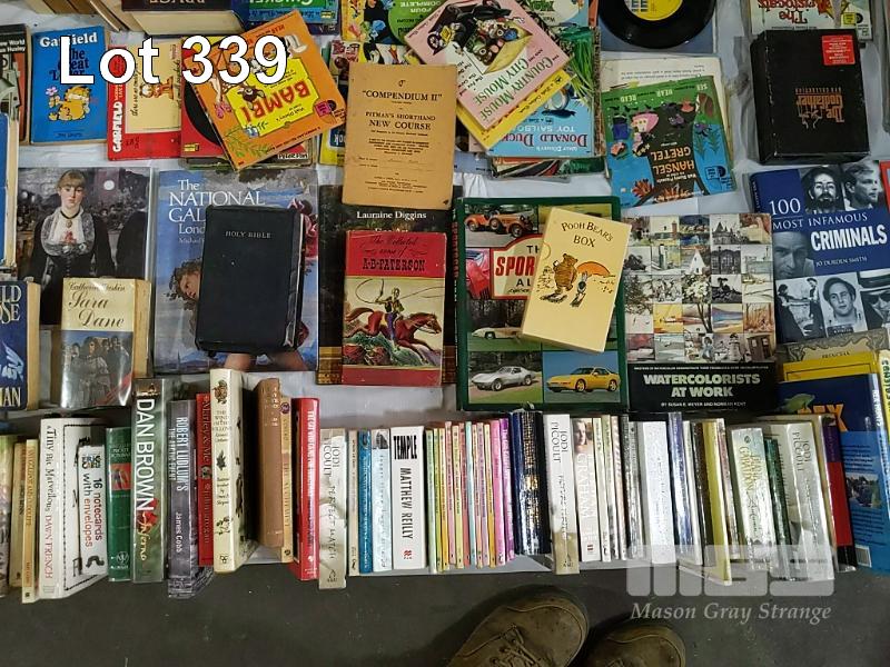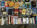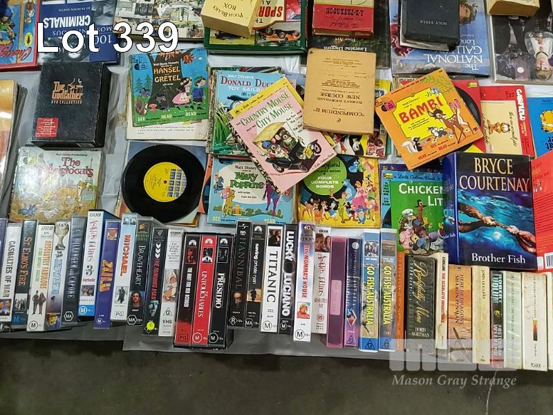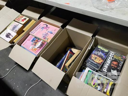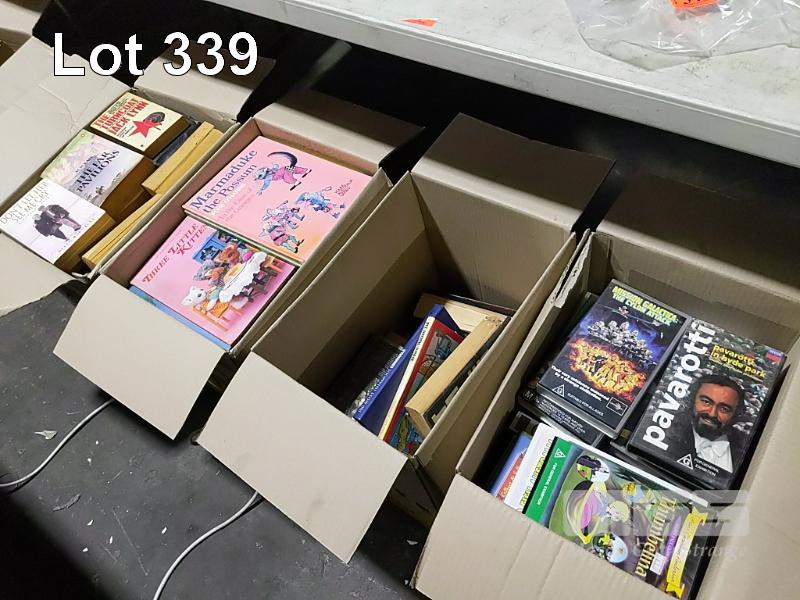 3 x BOXES OF BOOKS AND A BOX OF VINYL RECORDS AND VIDEOS (UNPACKED FOR DISPLAY)
