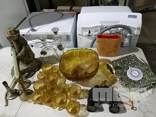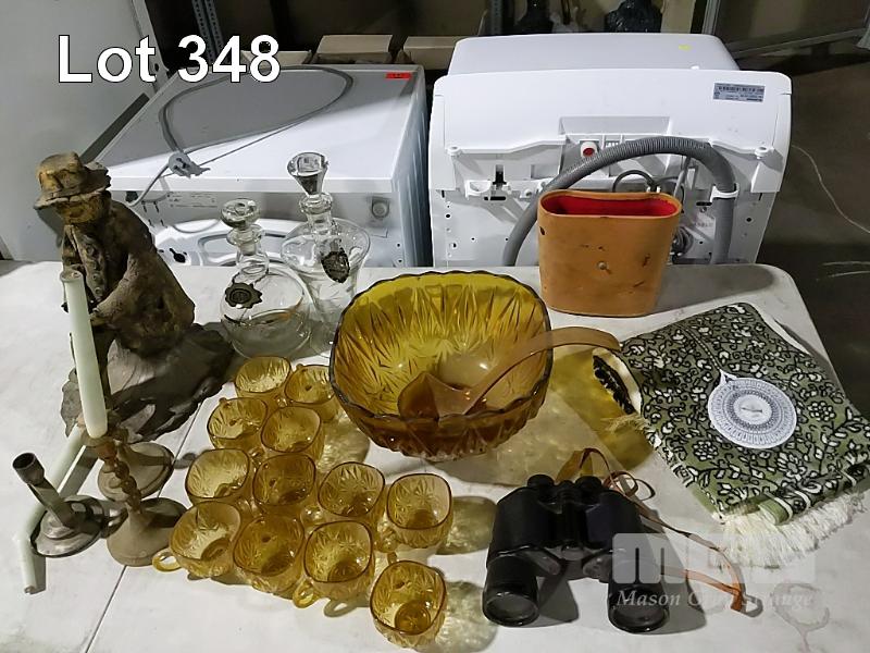 BINOCULARS, PRAYER MAT, WHISKEY CRAFTS, PUNCH BOWL AND CUPS, METAL CANDELABRAS AND CLAY FIRED FIGURE OF SITTING MAN.