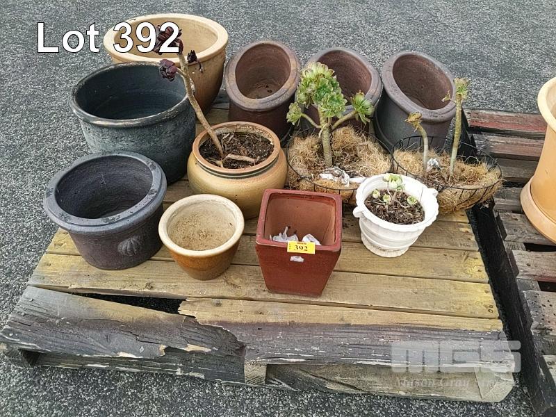 ASSORTED RUSTIC OVAL POTS, GLAZED CERAMIC POTS, HANGING BASKETS ETC