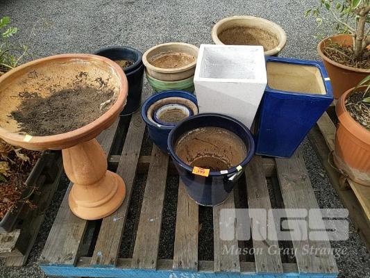 ASSORTED GARDEN POTS MEDIUM TO LARGE (12 ITEMS APPROX.) AND TERRACOTTA BIRDBATH.
