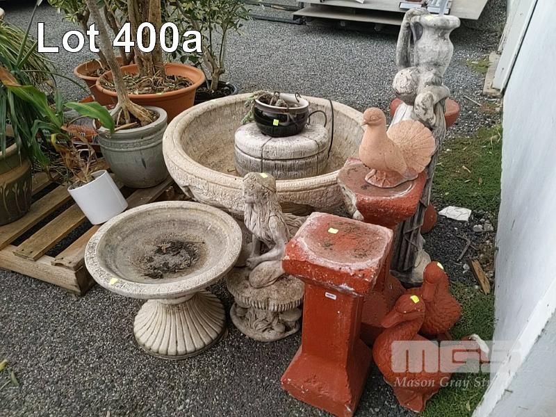 LARGE FOUNTAIN WITH PUMP AND WATER VENUS STATUE, GARDEN NYMPH, BIRD BATH, CONCRETE POT STANDS AND GARDEN DUCKS.