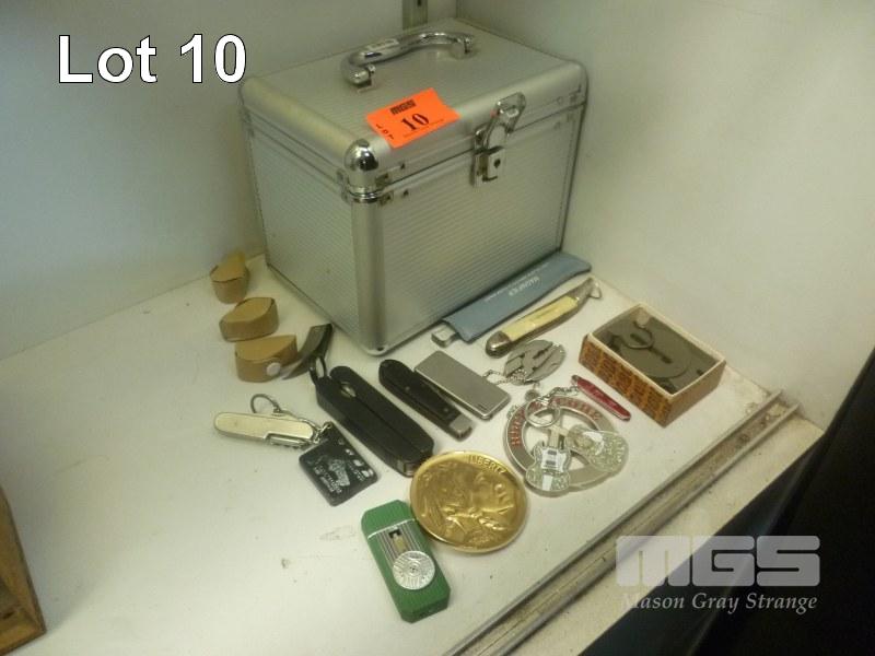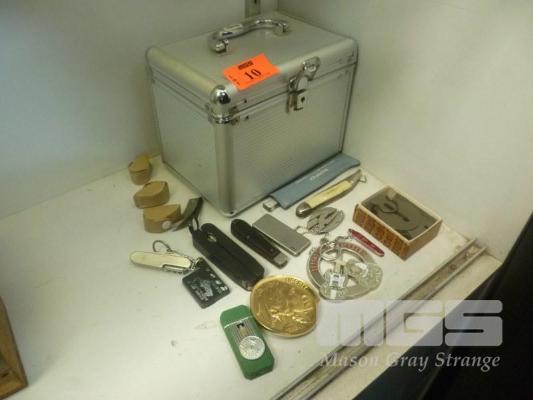 ASSORTED CURIOS INC JEWELLERS LOUPS, CIGARETTE LIGHTERS, BELT BUCKLES, COMPASS, POCKET KNIVES, ETC & ALUMINIUM CASE