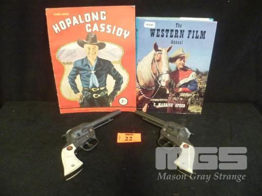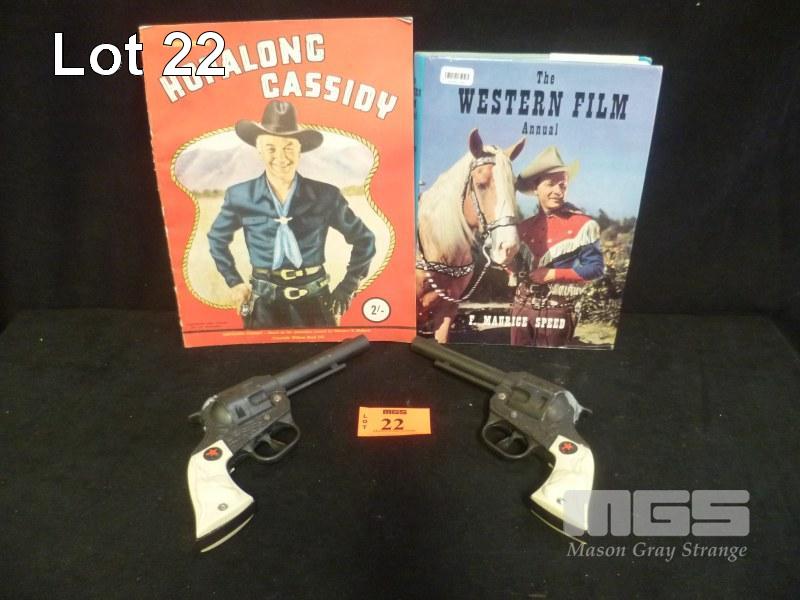 PAIR BRONCO CAP GUNS, HOPALONG CASSIDY MAGAZINE & THE WESTERN FILM ANNUAL