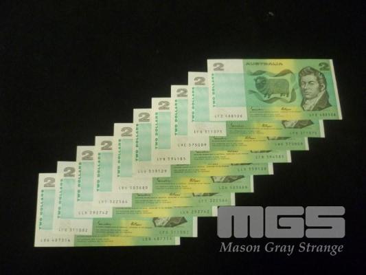 1985 10 x $2.00 NOTES MIXED PREFIX AND GRADES JOHNSTON FRAZER