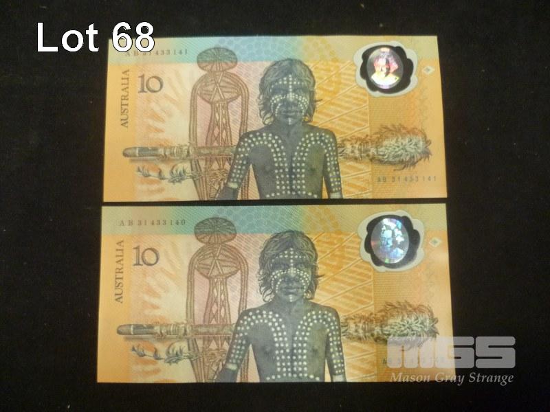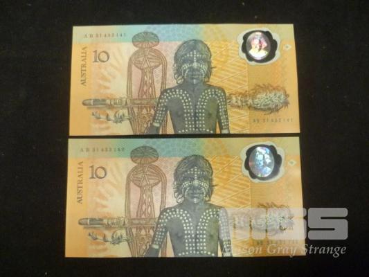 1988 2 x $10.00 NOTE COMMEMORATIVE CONSECUTIVE UNC