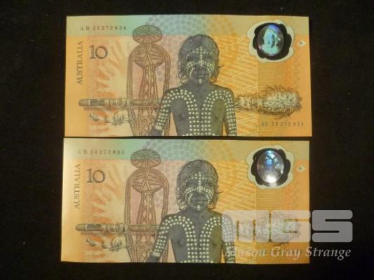 2 x AUSTRALIAN CONSECUTIVE 1988 COMMEMORATIVE $10.00 POLYMER BANK NOTES, FRASER/JOHNSTON, AB25272834-835