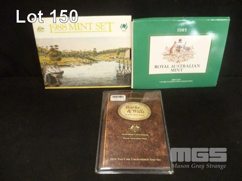 3 X ROYAL AUSTRALIAN MINT, UNCIRCULATED COIN SETS, INC; 1985, COIN SET, 1988 COIN SET & 2010, BURKE & WILLS COIN SET