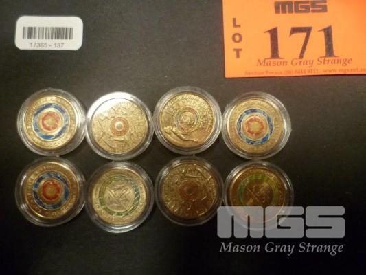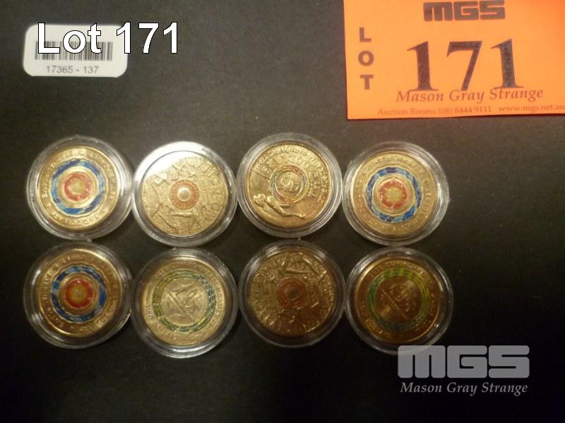 8 x COLOURED $2.00 COINS, LEST WE FORGET, COMMONWEALTH GAMES