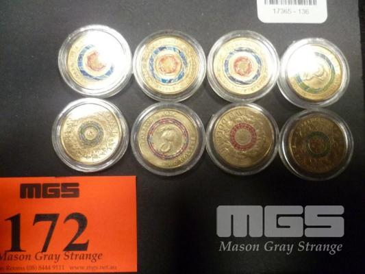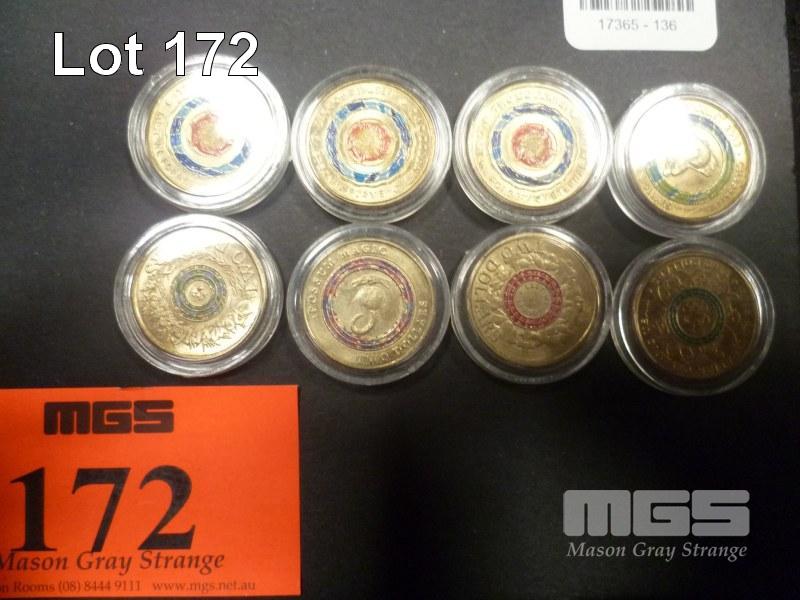 8 x COLOURED $2.00 COINS, LEST WE FORGET, POSSUM MAGIC