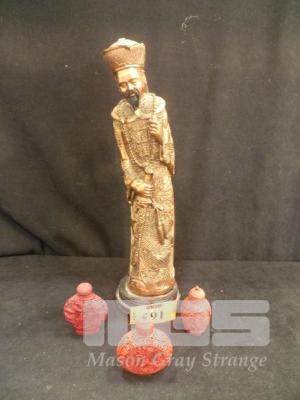 3 x ASIAN CARVED SNUFF BOTTLE & FIGURE