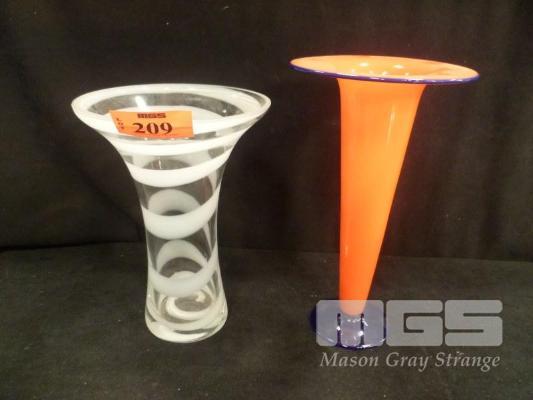 2 x SIGNED PIECES GLASS VASES, 25 & 28cm (H), ORANGE/BLUE & WHITE & CLEAR