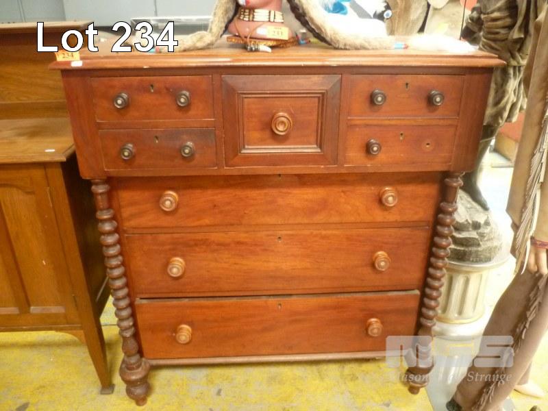 MAHOGANY 8 DRAWER CHEST WITH TURNED SIDE COLUMNS & MOTHER OF PEARL CENTRED KNOBS