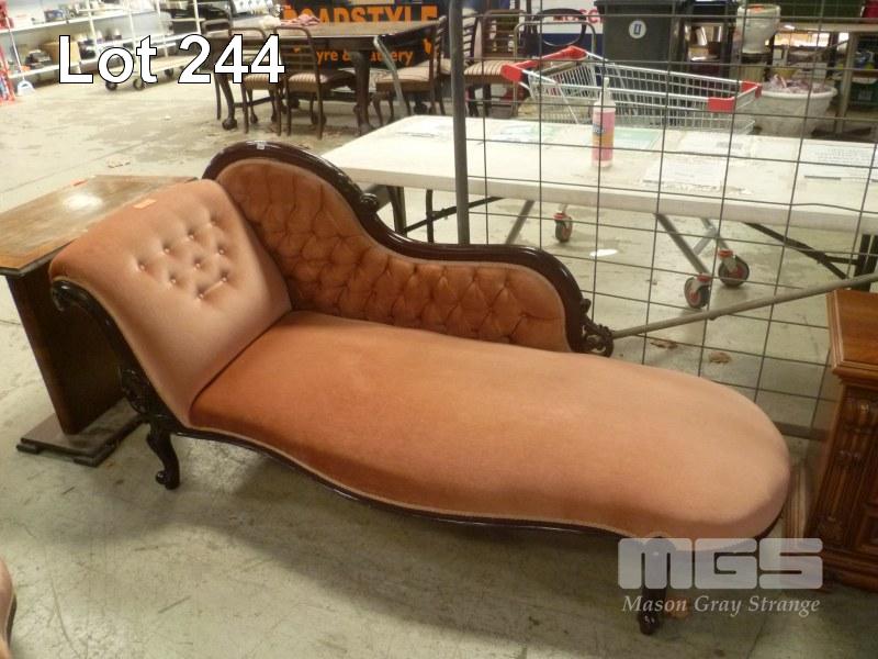 VINTAGE CHAISE LOUNGE, ORNATE CARVED TIMBER, PINK VELVET, DEEP BUTTON