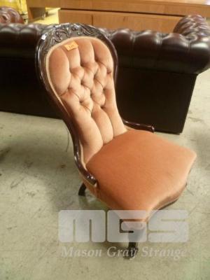 VINTAGE GRANDMOTHER CHAIR, ORNATE CARVED TIMBER, PINK VELVET, DEEP BUTTON