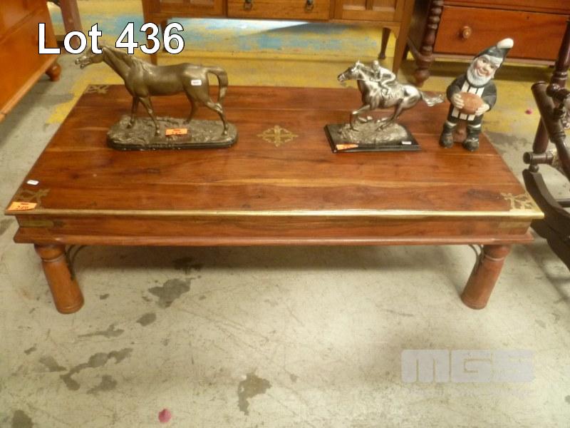 PINE RECTANGULAR COFFEE TABLE, BRASS TRIM & INSERTS