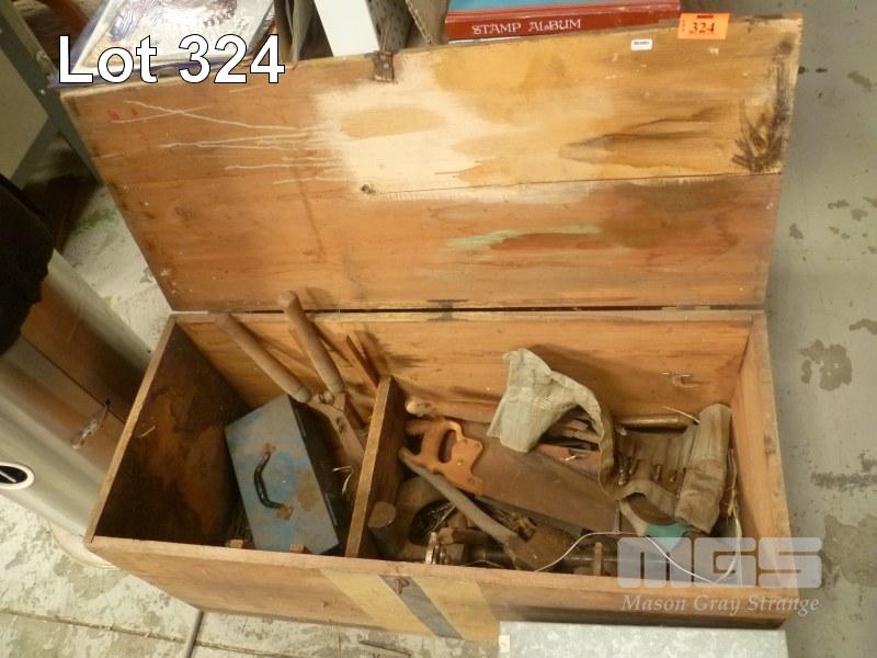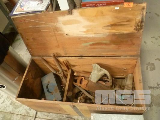 TIMBER TRUNK WITH ASSORTED CARPENTRY TOOLS