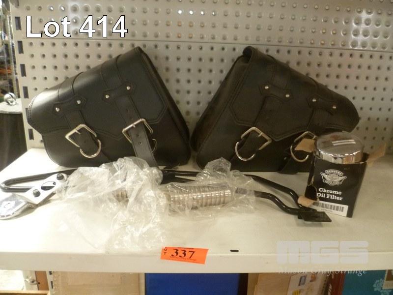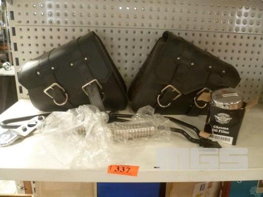 PAIR HARLEY DAVIDSON SADDLE BAGS, FOOT PEGS & OIL FILTER